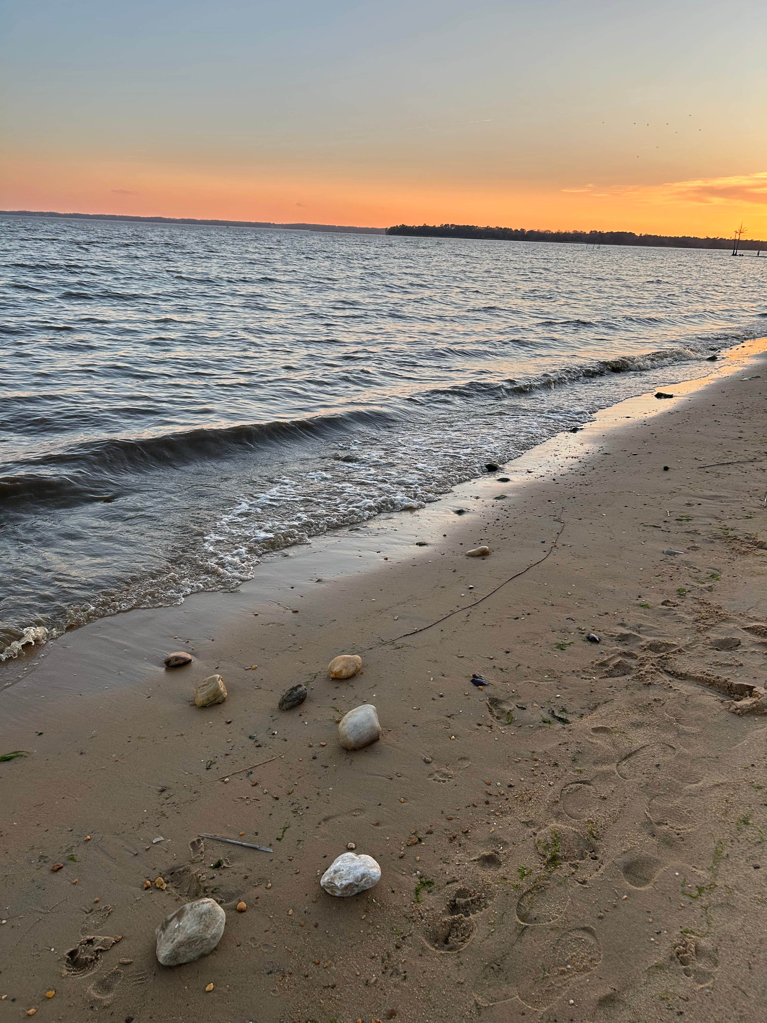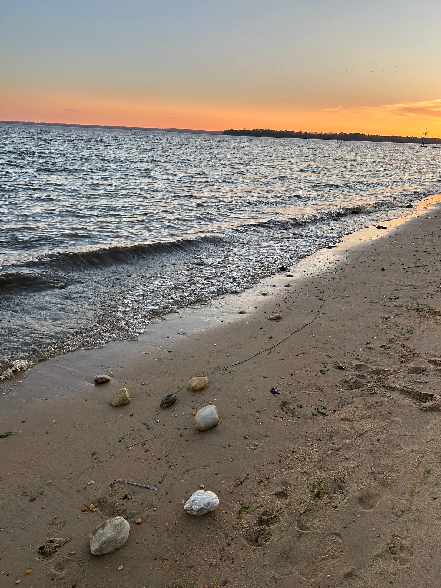 Its sand dots the other side, sways so close I see the sine waves of pine branches in sunset. A solitary spot of red signals for sails and motors alike, though solely seagulls and geese squawk and honk in kind. I swim glances beyond the brackish susurrus, beyond the sublime bargain of premature seventies before the ides of March, beyond the crepuscular song (so out of tune) of that geese couple, a couple of sapling -like leaves amid the senescent. They whisper of starting over before the river takes to the sea.